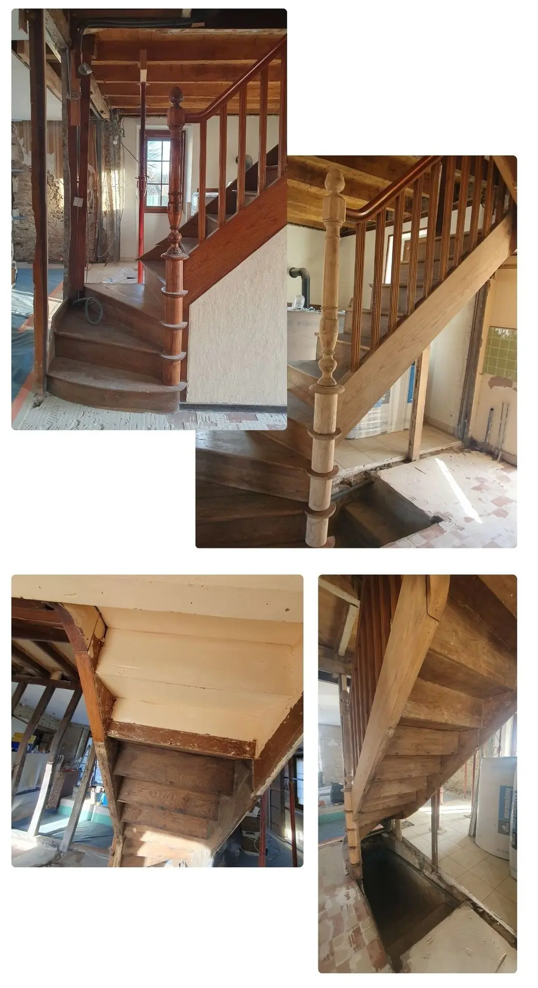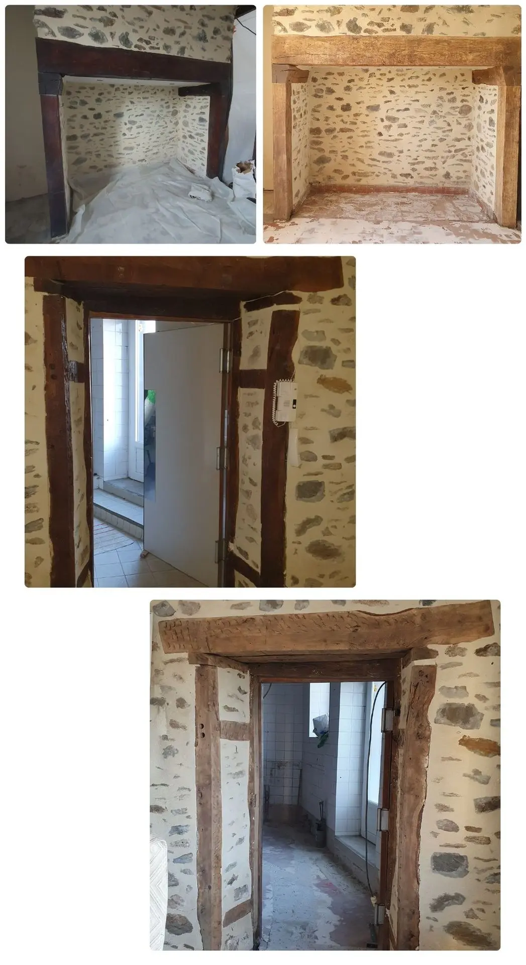 Poutres d'un cantou, d'une porte et une partie de l'escalier dans une maison en restauration.