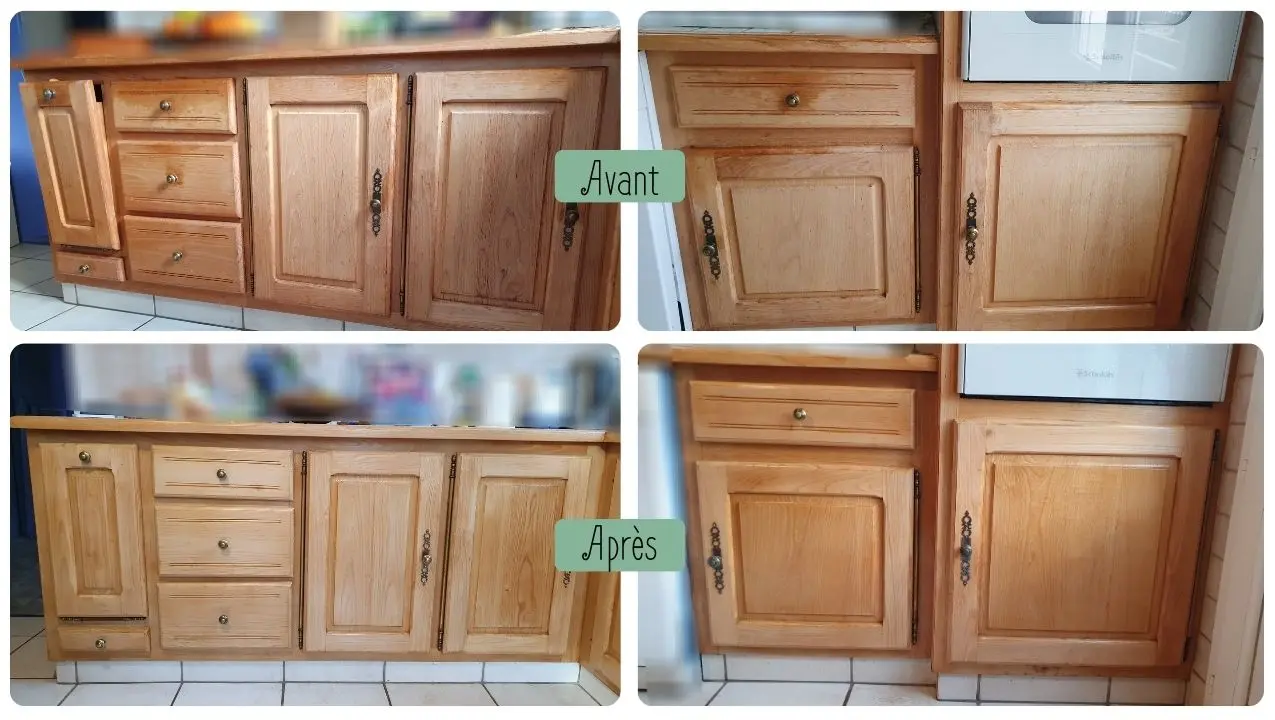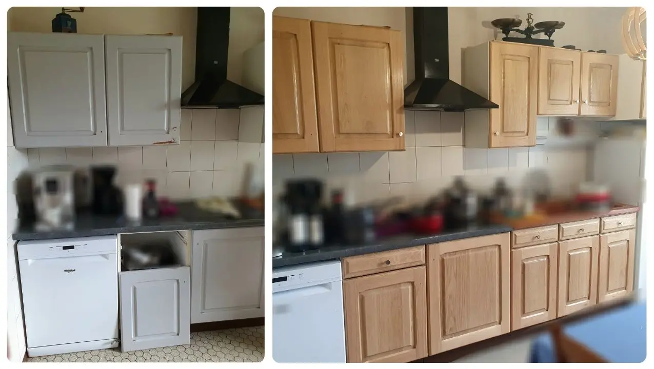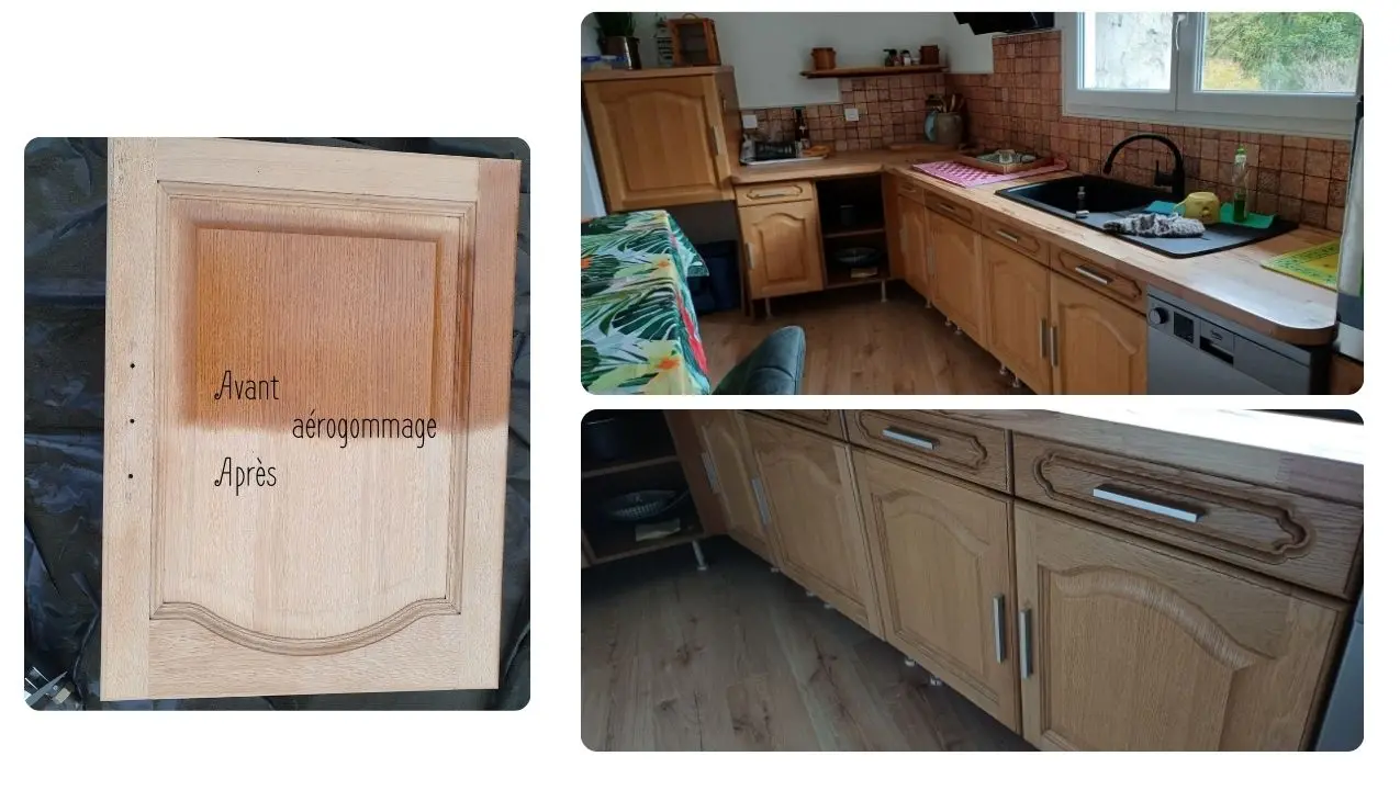 Rénovation de cuisine en bois massif (chêne, châtaignier, ...) Aérogommer - Poncer - Vernis