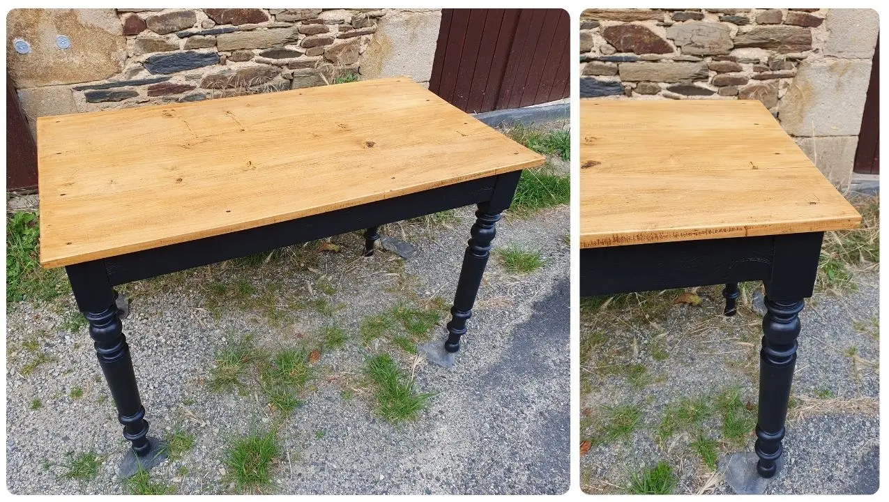 Aérogommage, ponçage, finition vernis naturel mat pour le plateau et piétement peinture noir.
