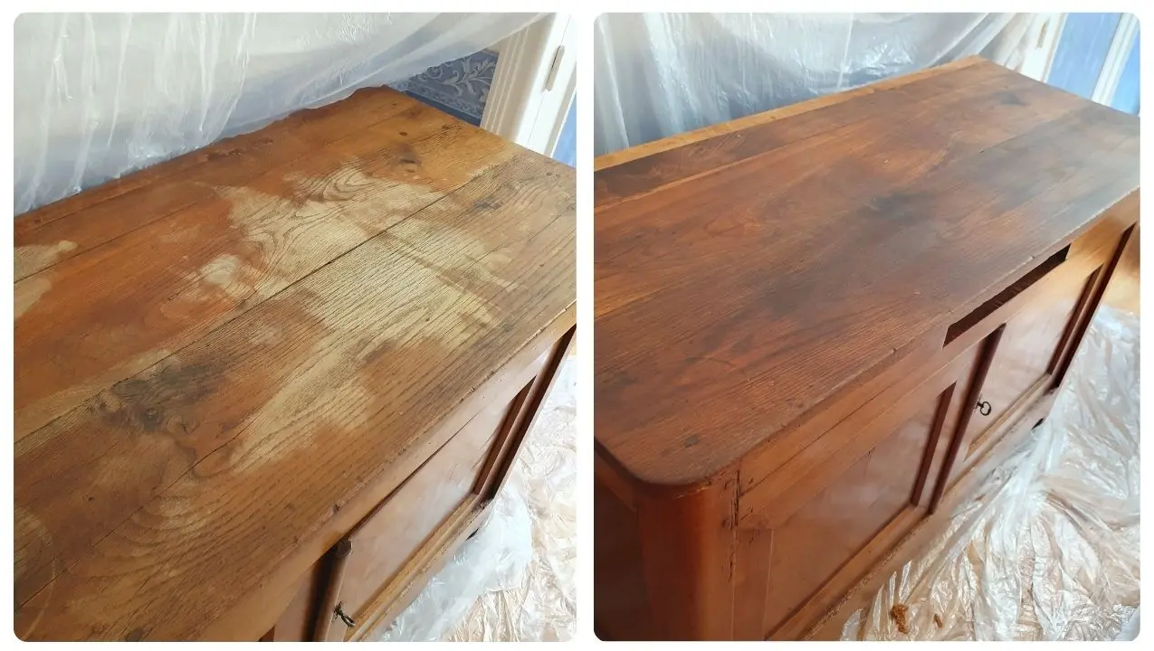 Nettoyage de la cire sur le plateau, un bon coup de ponçage et une nouvelle finition cirée.