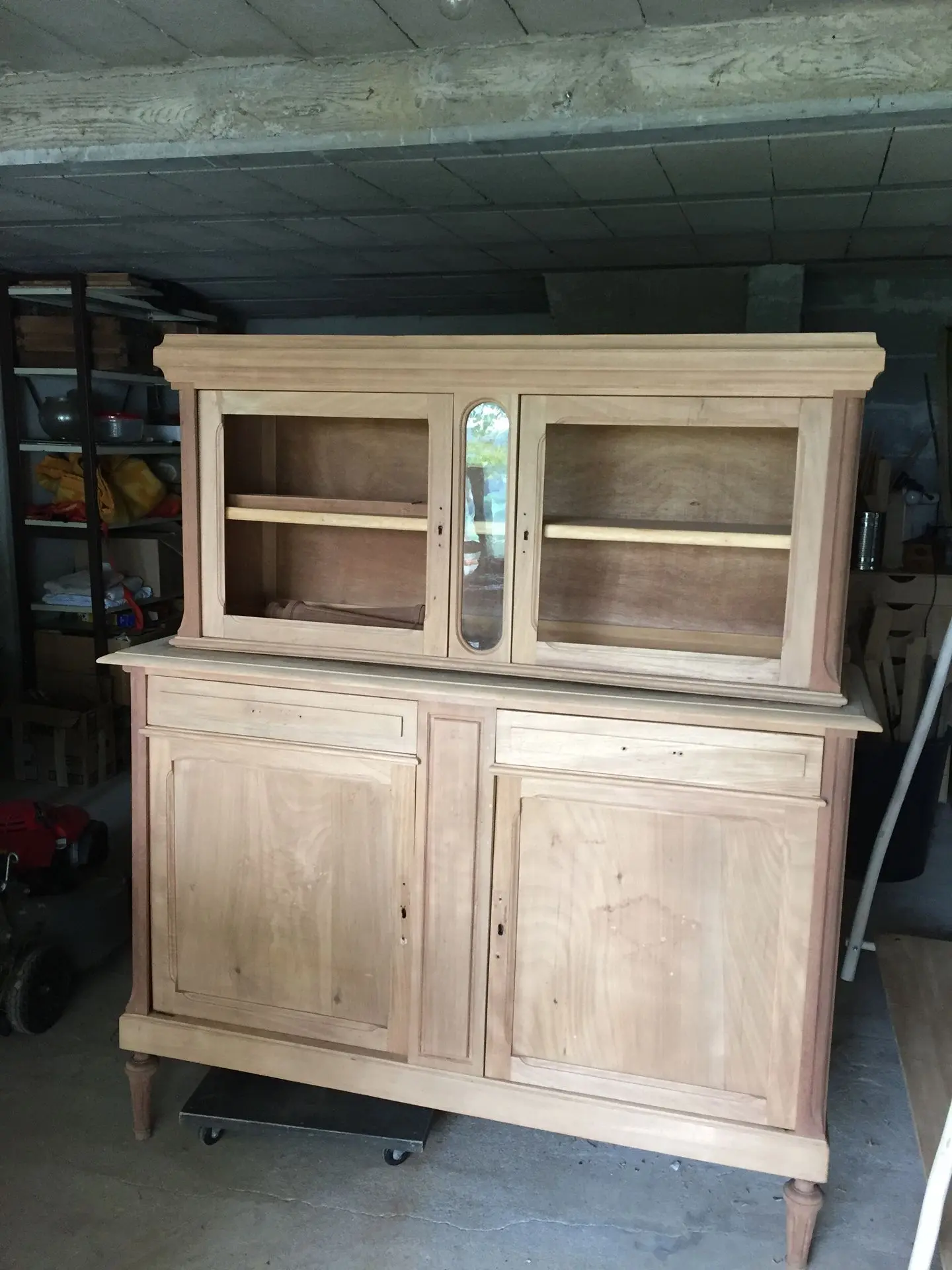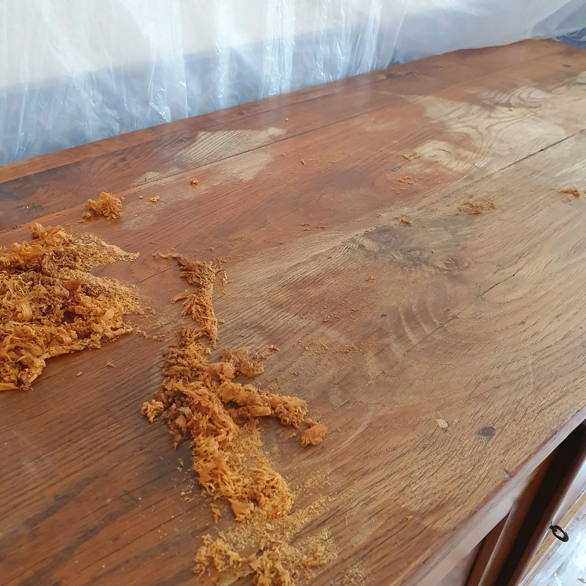 Nettoyage de la cire sur le plateau, un bon coup de ponçage et une nouvelle finition ciré.