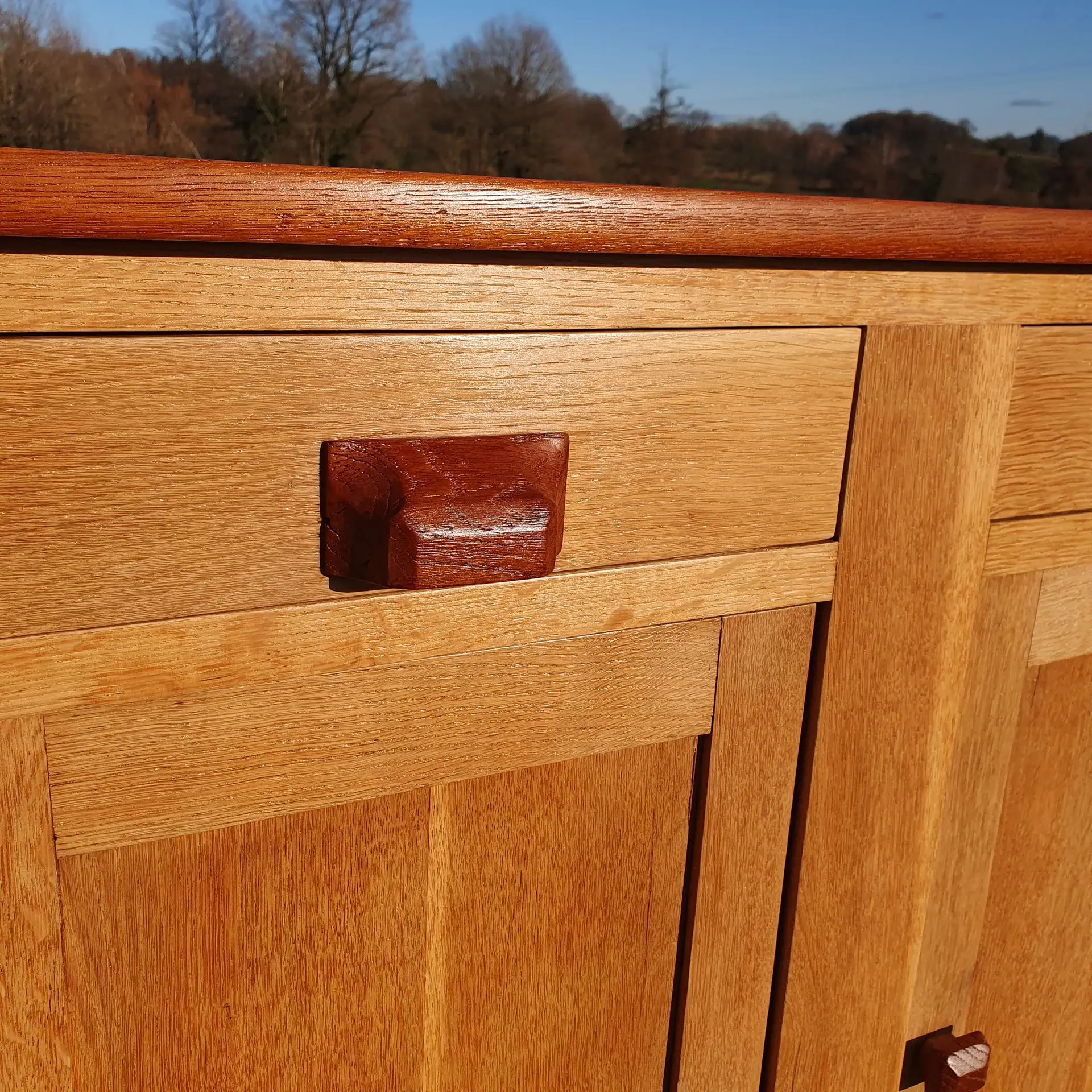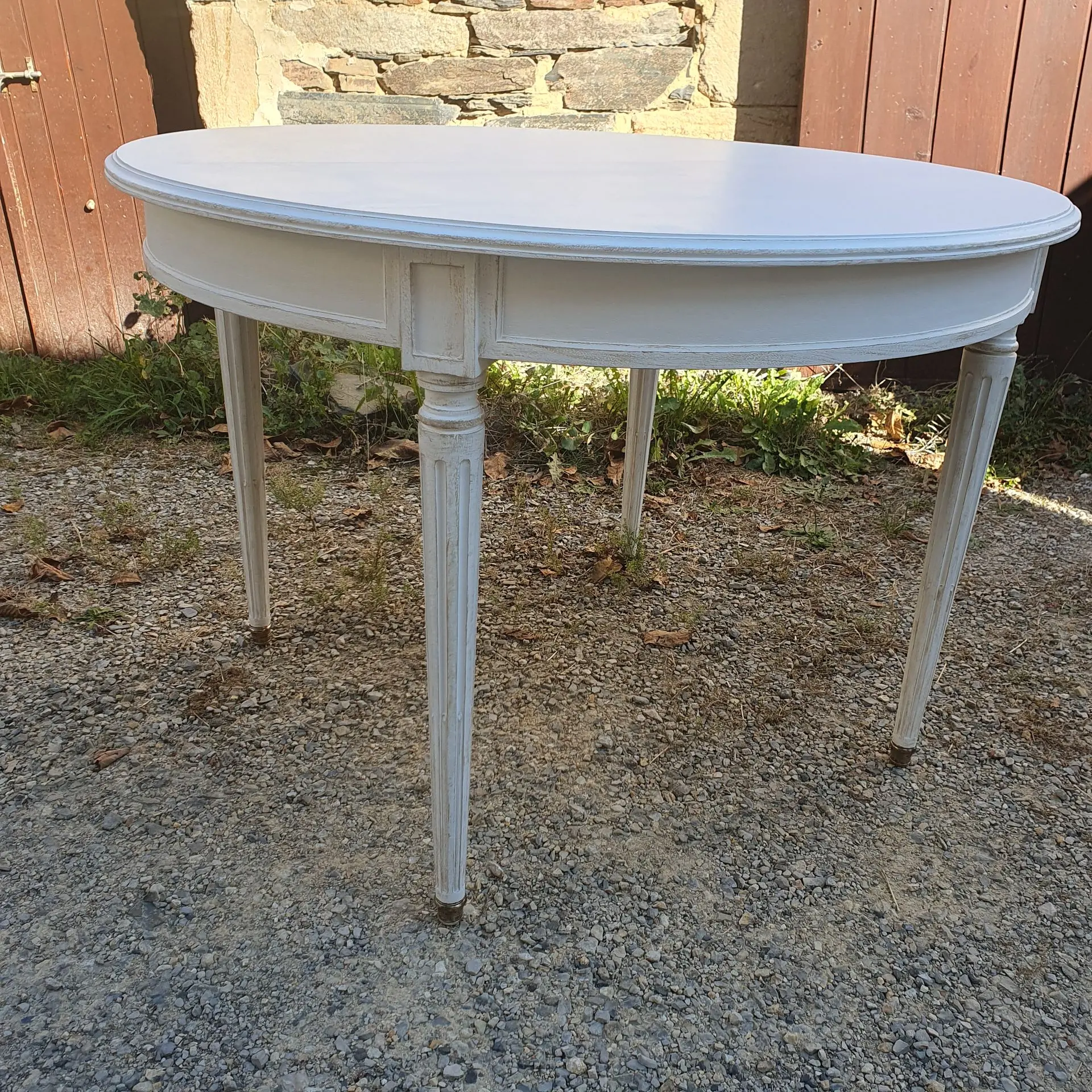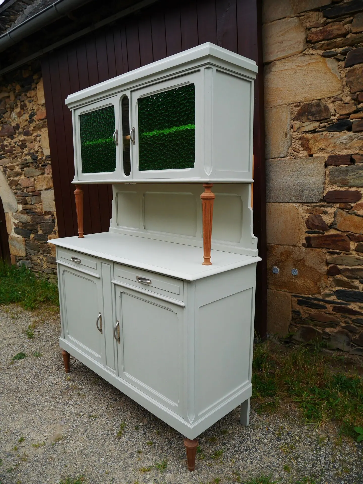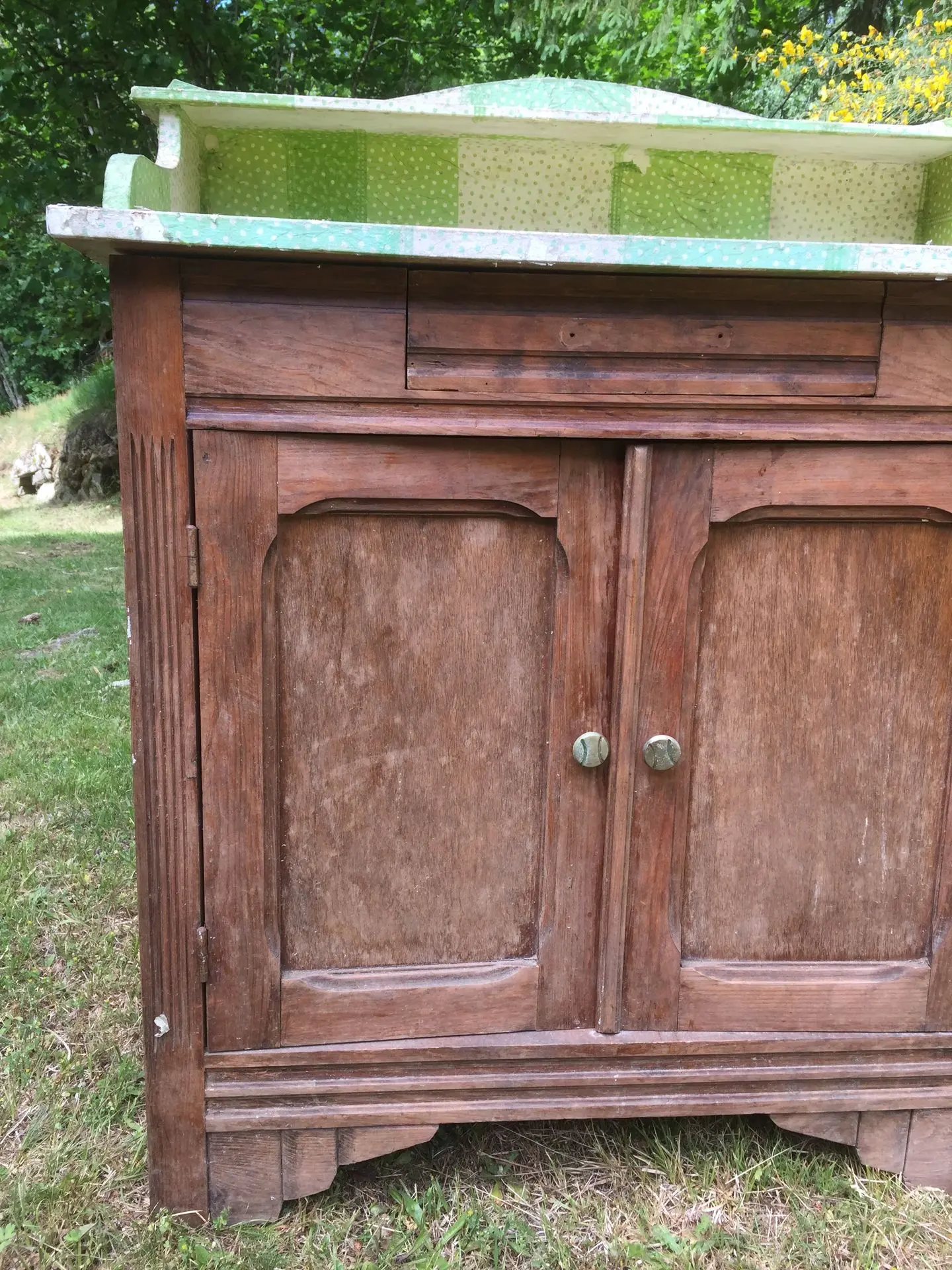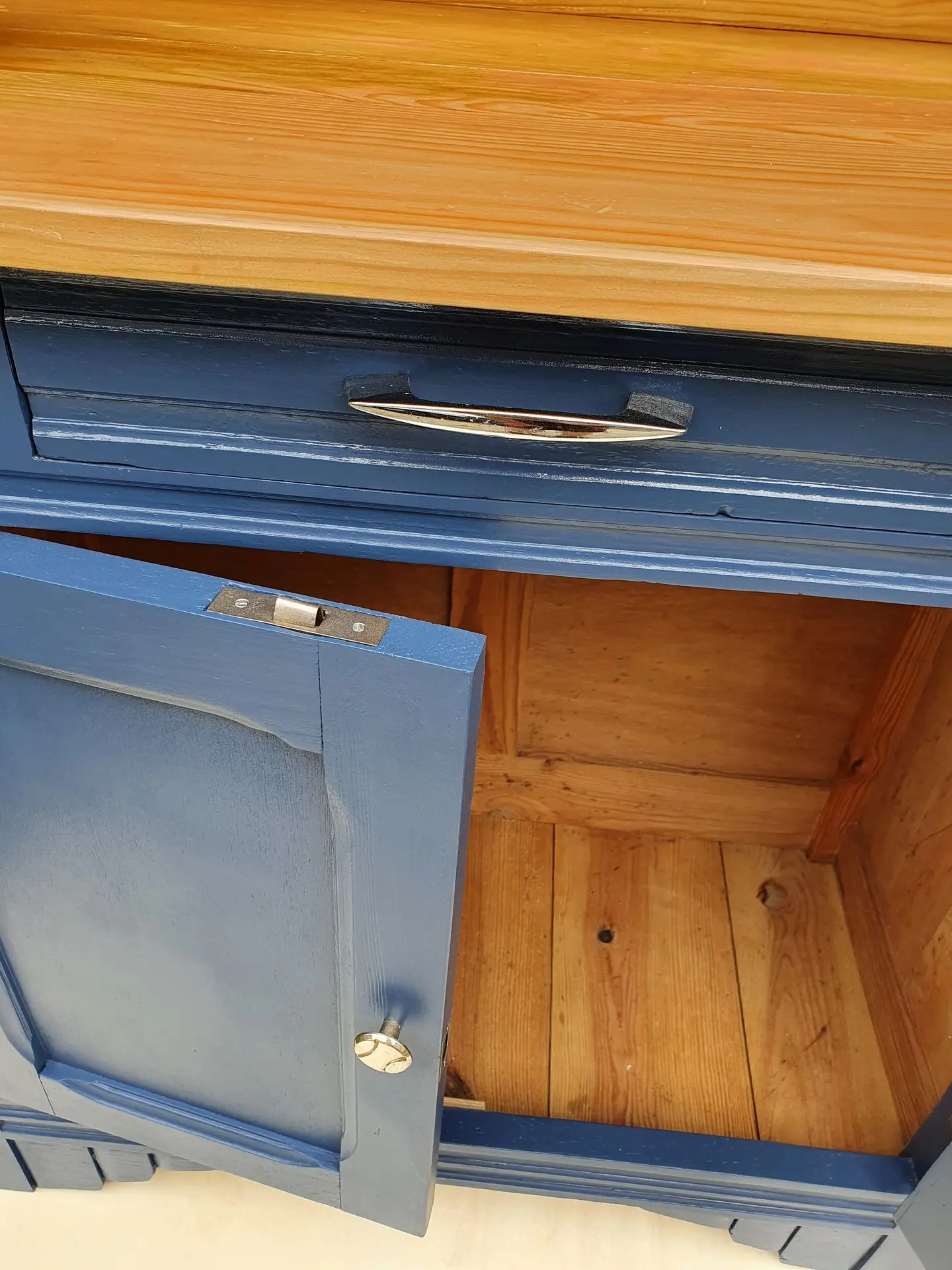 Ponçage, teinte sur le plateau et les jolies poignées, finition vernis naturel satiné.