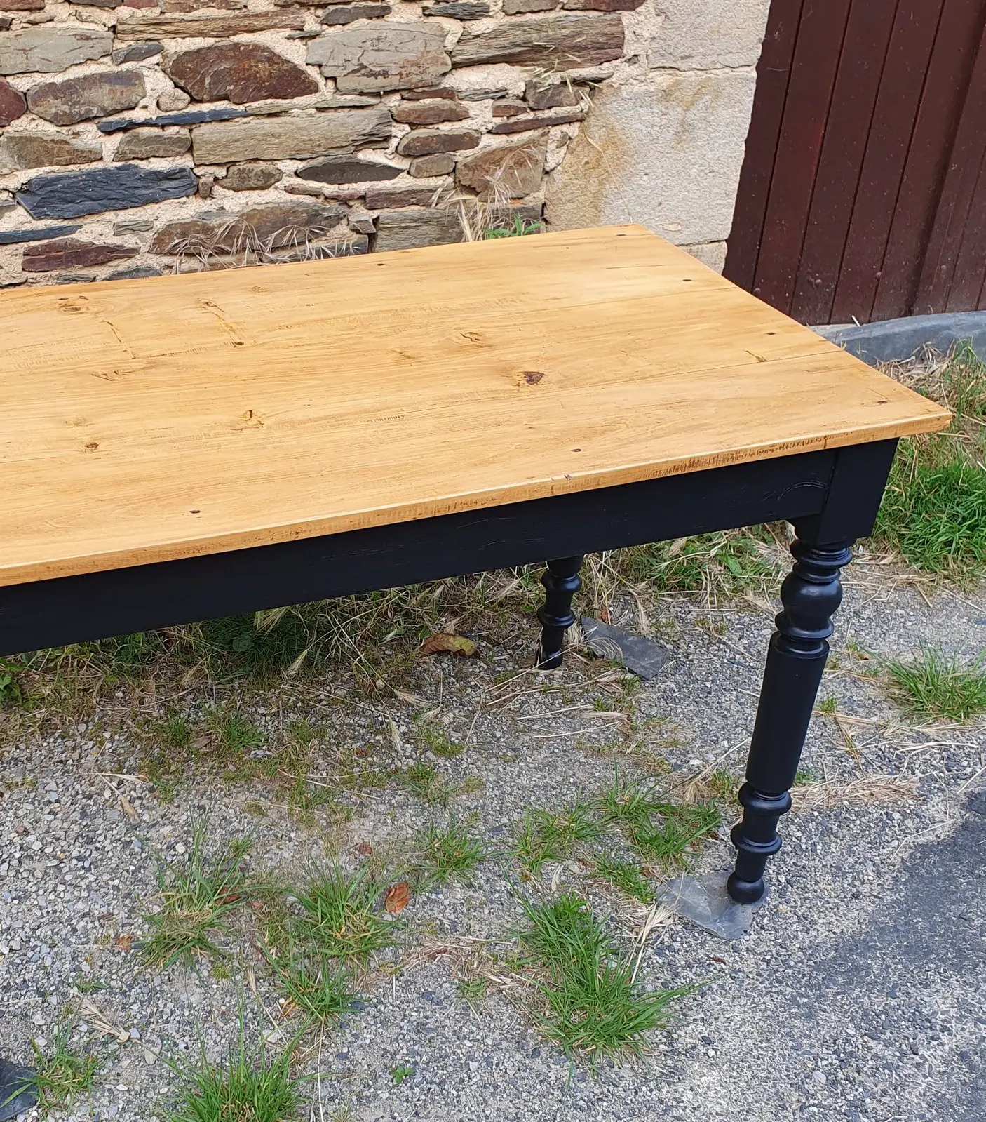 Aérogommage, ponçage, finition vernis naturel mat pour le plateau et piétement peinture noir.