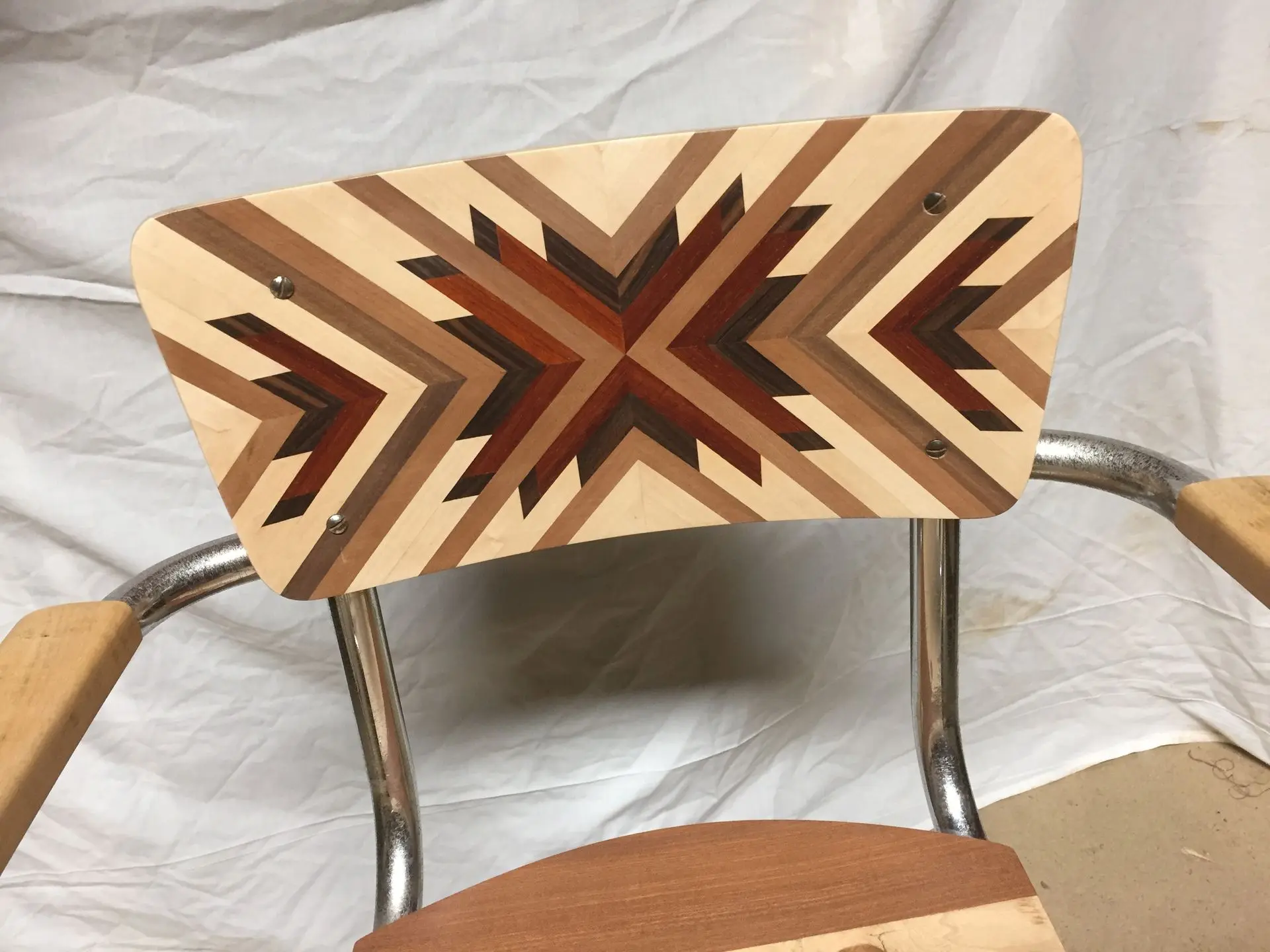 Restauration de l'assise ainsi que du dossier, il a fallu le recollé et rajouter des morceaux manquants. Nettoyer l'ossature métallique. Réalisation de la marqueterie.